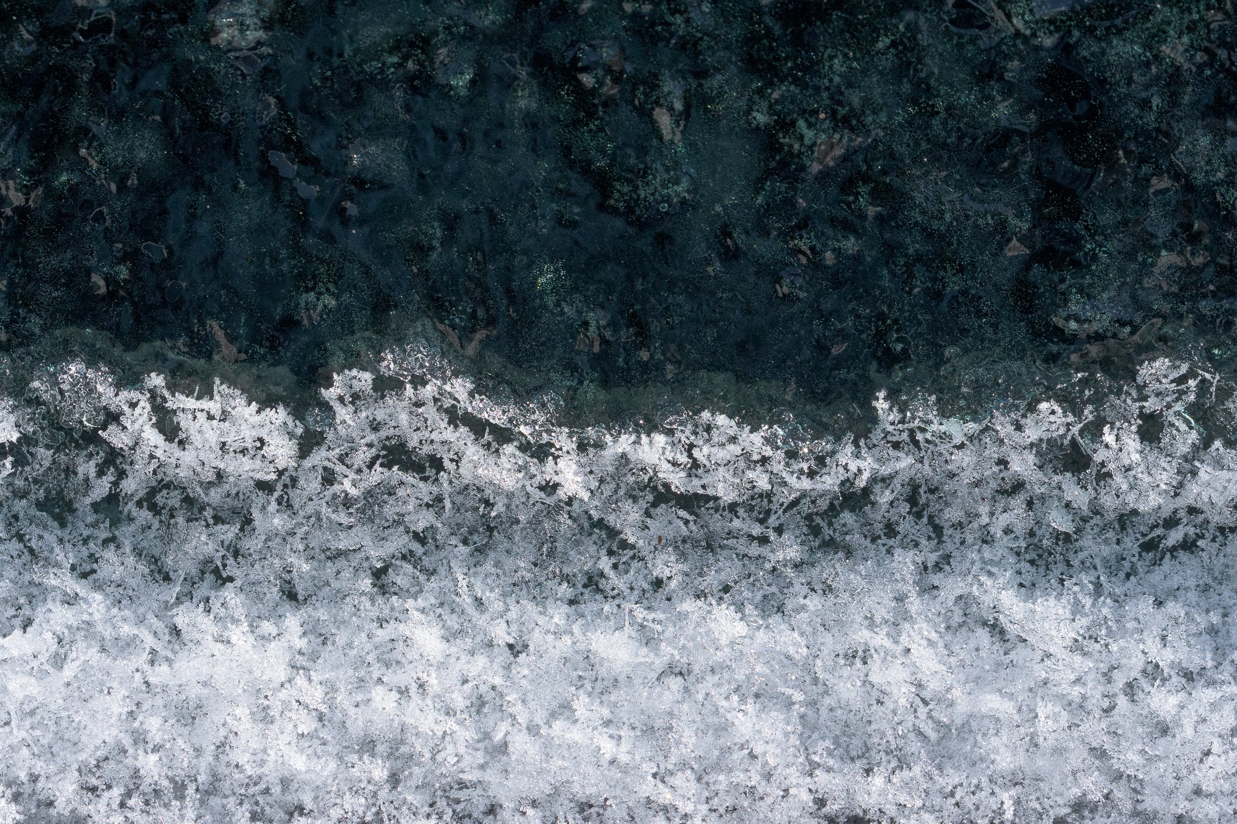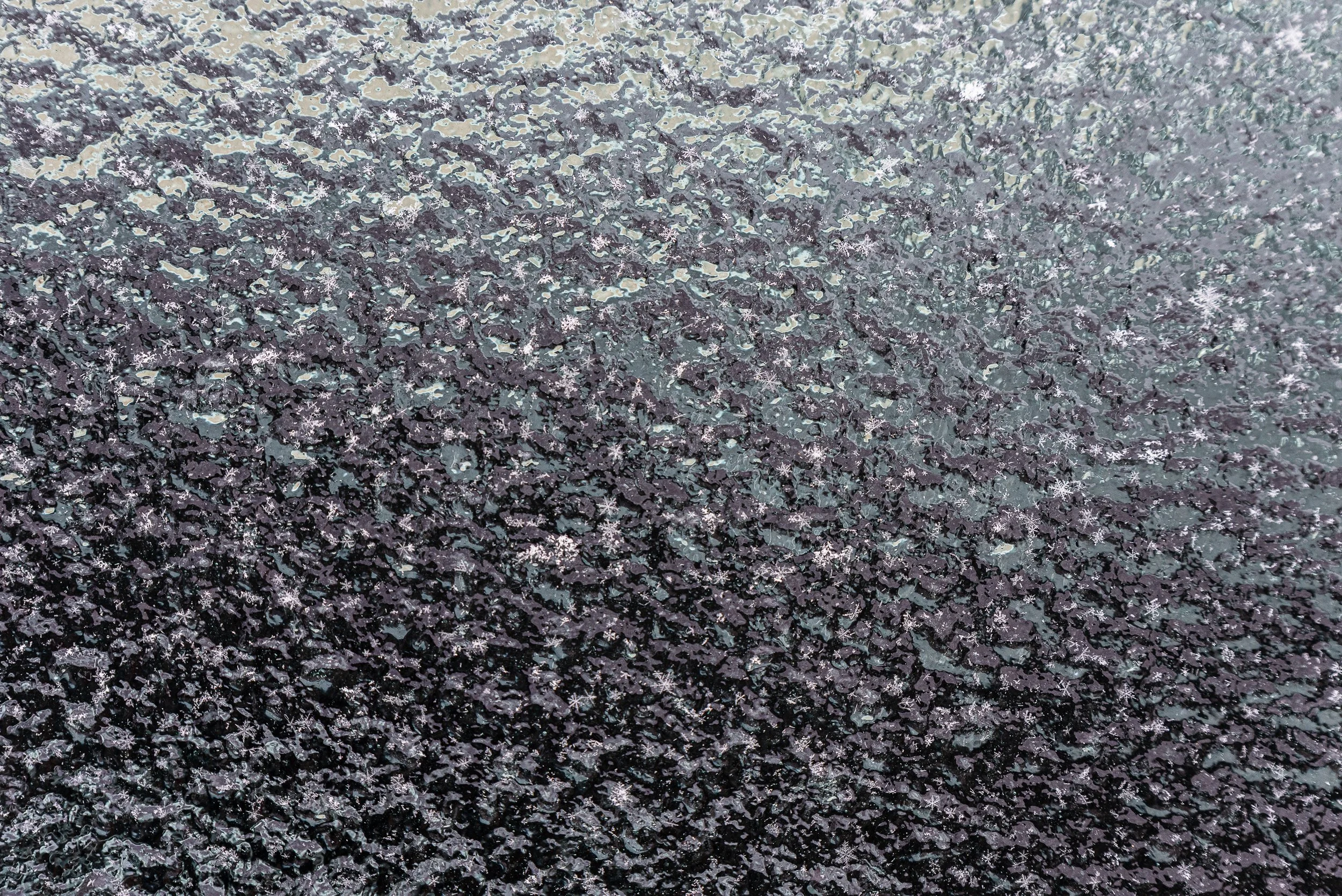 In the second image, which is against a different icy window, I chose to move closer and fill half of the frame with the snow that had gathered at the bottom of the window. This particular abstract scene drew me in because of the transition that occurs moving upward through the image. The gathered snow is more prominent at the bottom and thins out before reaching the dark, ice-covered window. There’s textural, tonal, and color contrast all working together simultaneously to form this abstract photograph. It reminds me of an aerial view of waves in the water and is my favorite in the set.
